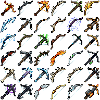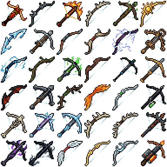 36 Bows and Crowsbows for any game, made in aseprite, every image as png and a spritesheet with all.