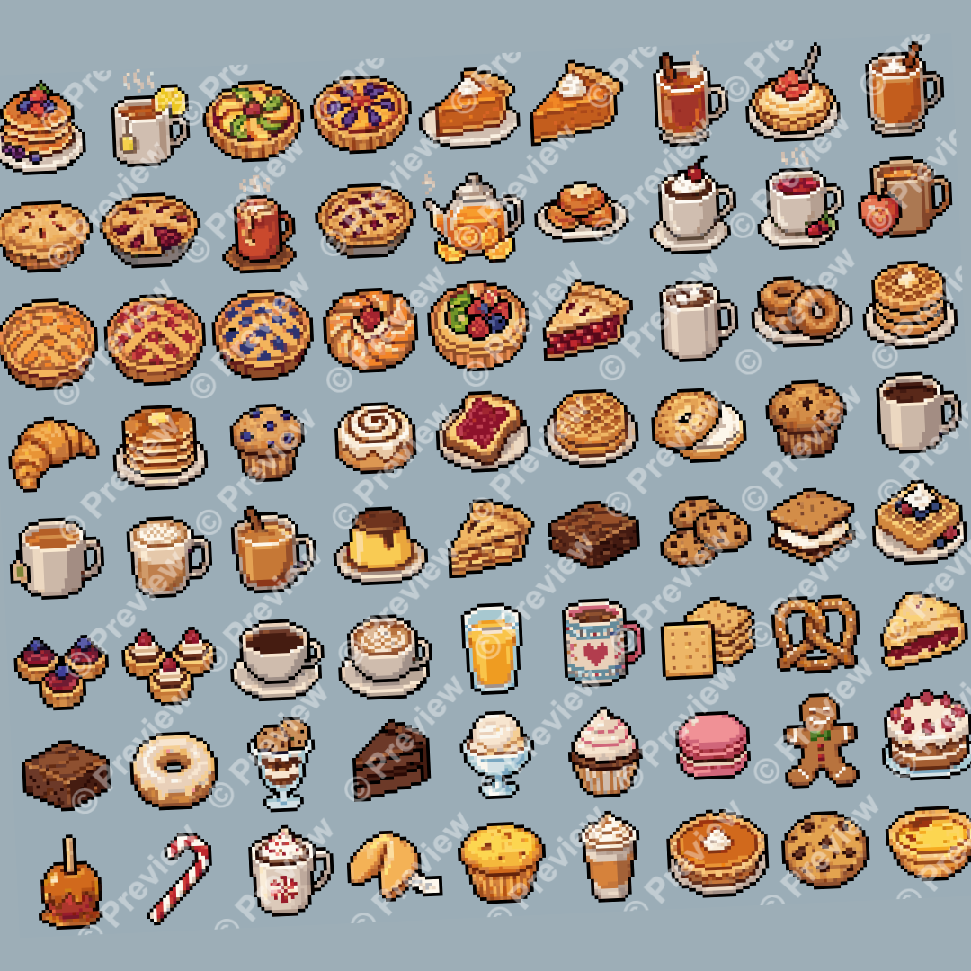 72 Cafe and desserts icons 32x32, perfect for cozy games and shops, every image as png and a spritesheet with all.