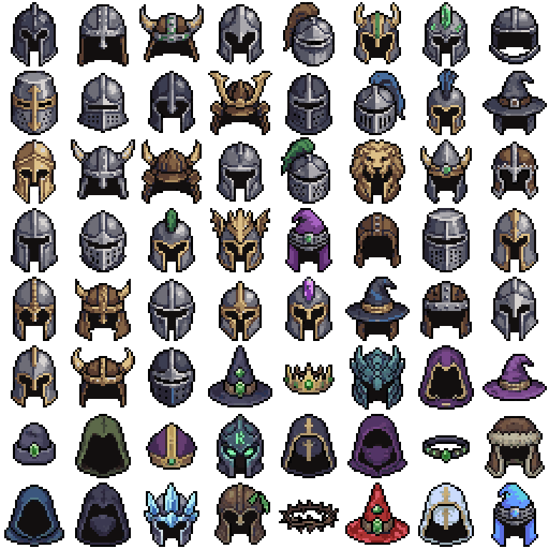 64 Pixel Art Helmets, Cloth, Leather and plates for every type of character, made in aseprite, 32x32, Every image as png and a spritesheet with all.