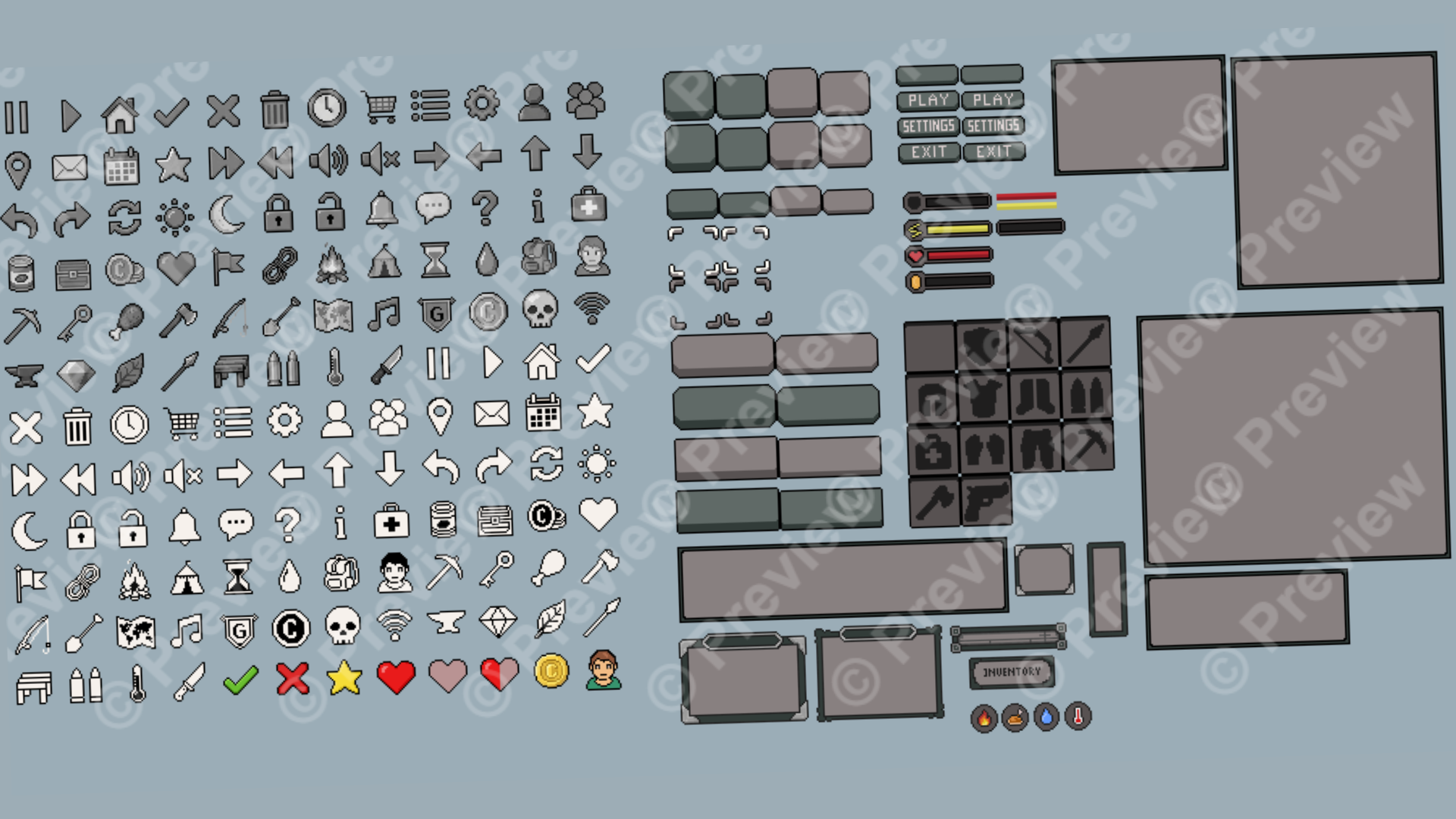 Survival user interface 32x32 assets, Icons, buttons, panels, bars, inventory and character items, every image as png and a spritesheet with all.