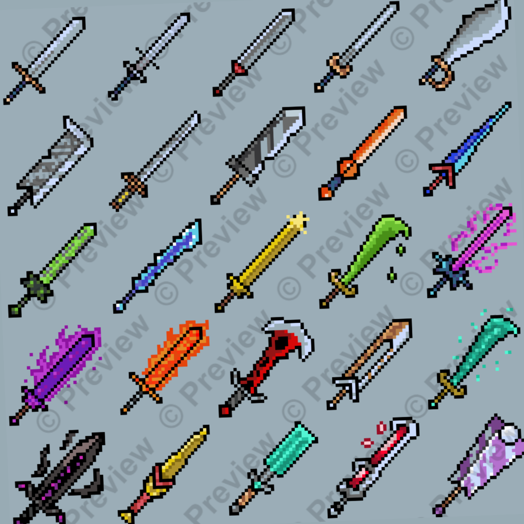 25 swords in 32×32 pixel art, hand-drawn in Aseprite, including both normal and magical versions for use in any type of game.